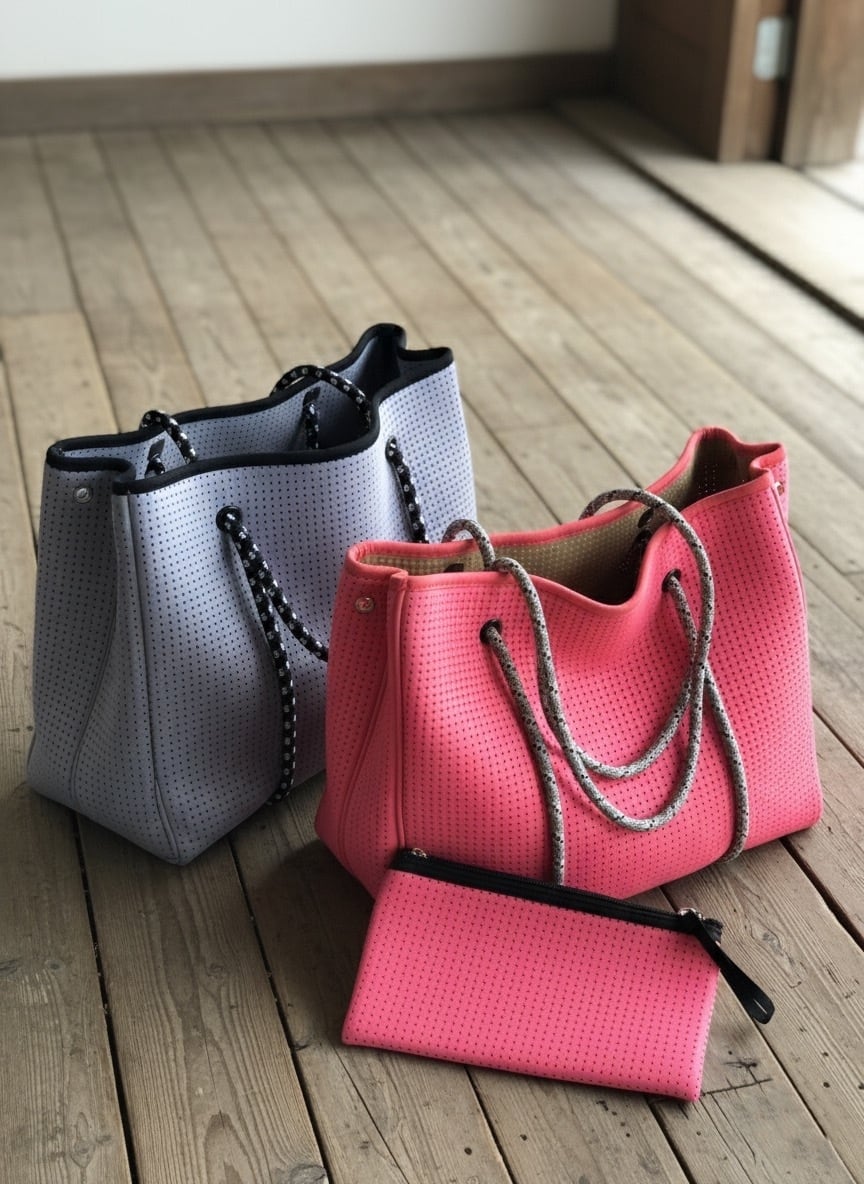 ダイバーが着用するウェットスーツの素材で作られたバッグ、ネオプレンバッグ。